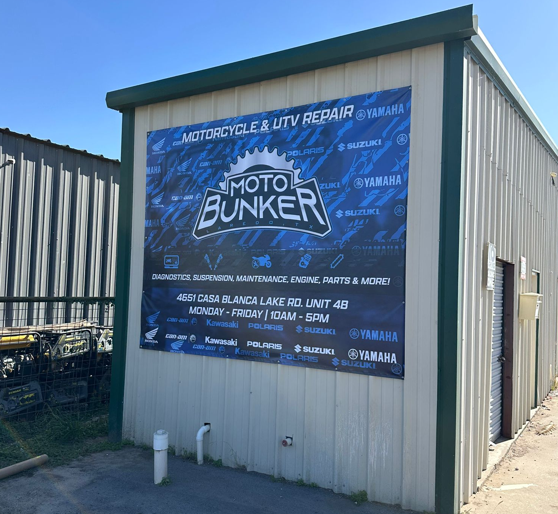 The completed wall wrap transformed the exterior of Moto Bunker into a large-scale promotional display that clearly communicates the shop’s services and brand identity. The bold design helps the building stand out while providing essential information to potential customers passing by. The wrap acts as both signage and marketing, giving Moto Bunker a professional storefront presence while reinforcing its reputation as a dedicated motorcycle and UTV repair service.