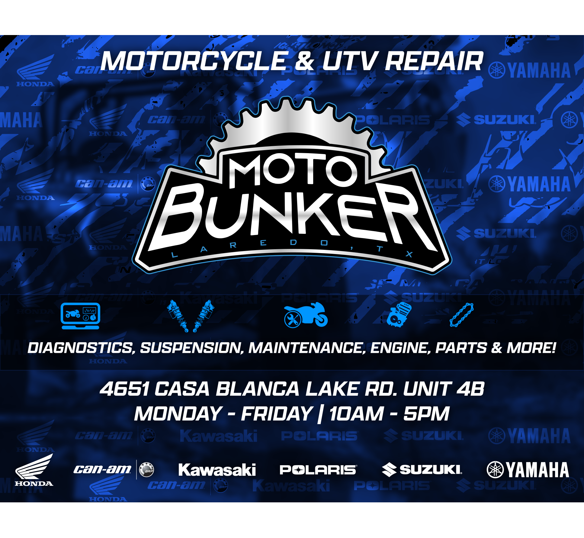 The final design centers around the Moto Bunker logo, creating a strong visual focal point that establishes brand recognition immediately. A blue performance-inspired background pattern was used to create depth while reinforcing the motorsports theme of the business. Clear typography was used to highlight the shop’s primary services, including diagnostics, suspension work, maintenance, engine repair, and parts. Supporting icons were incorporated to visually represent these services and improve quick recognition.